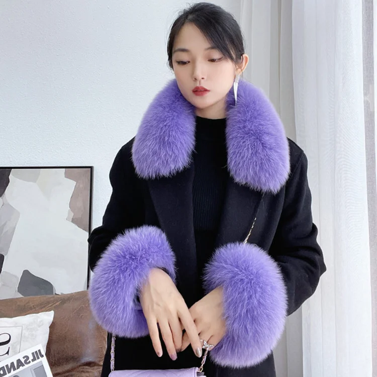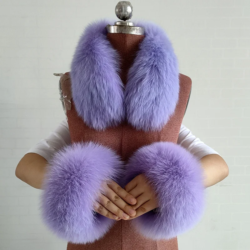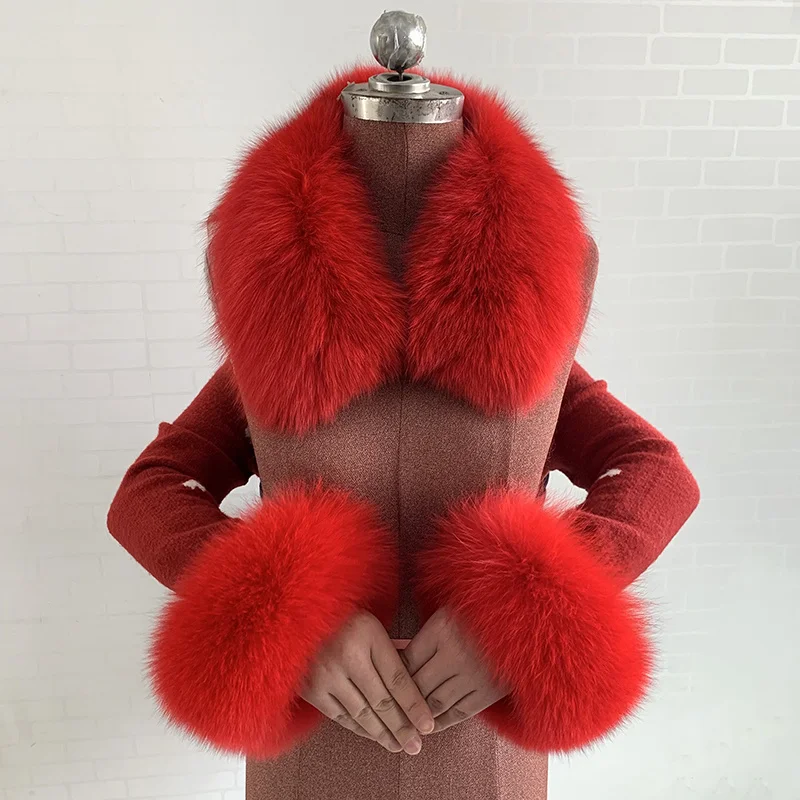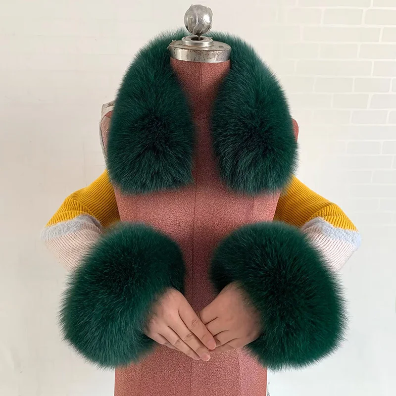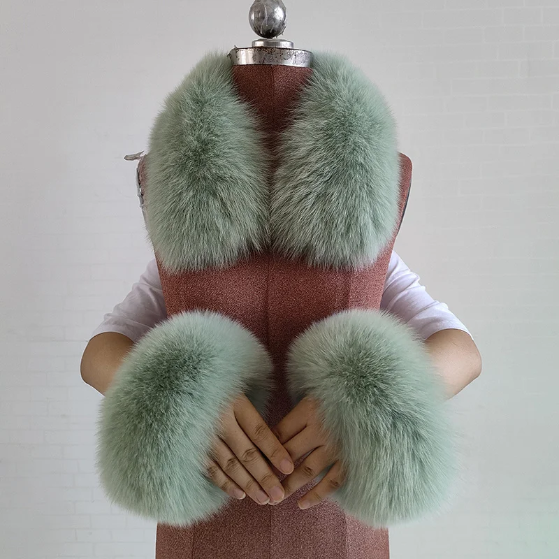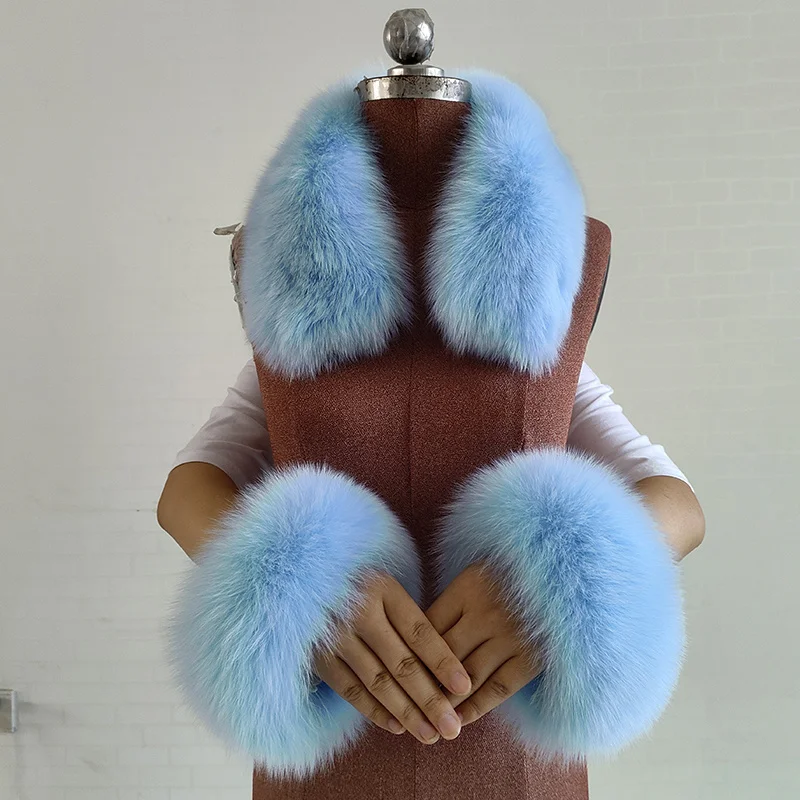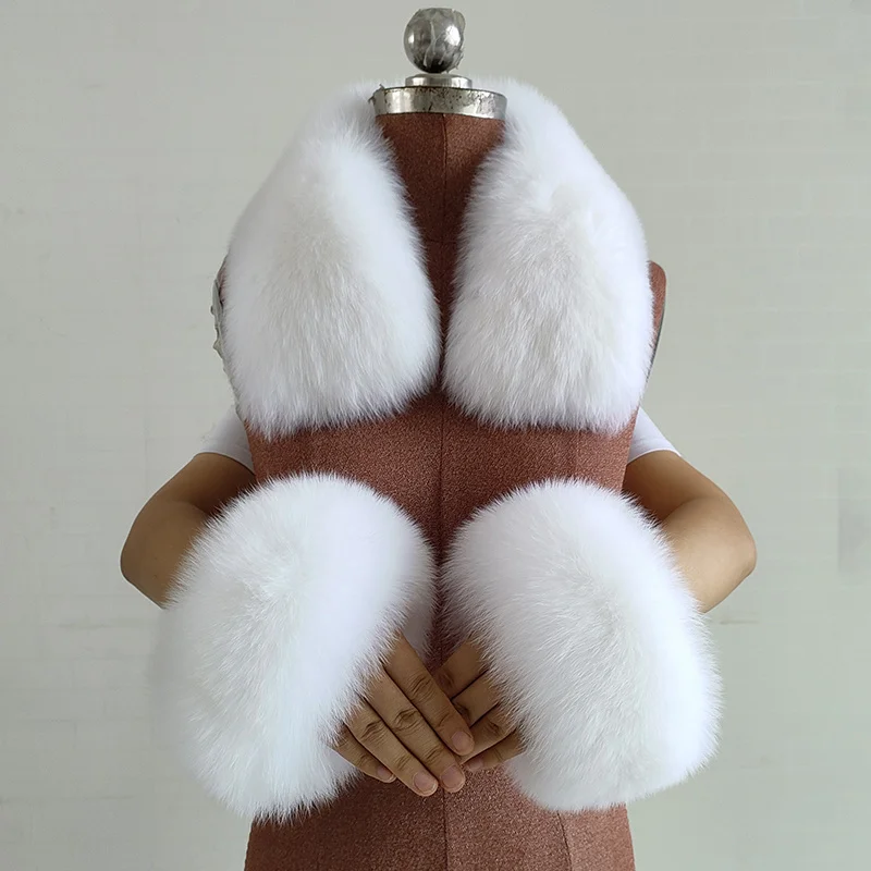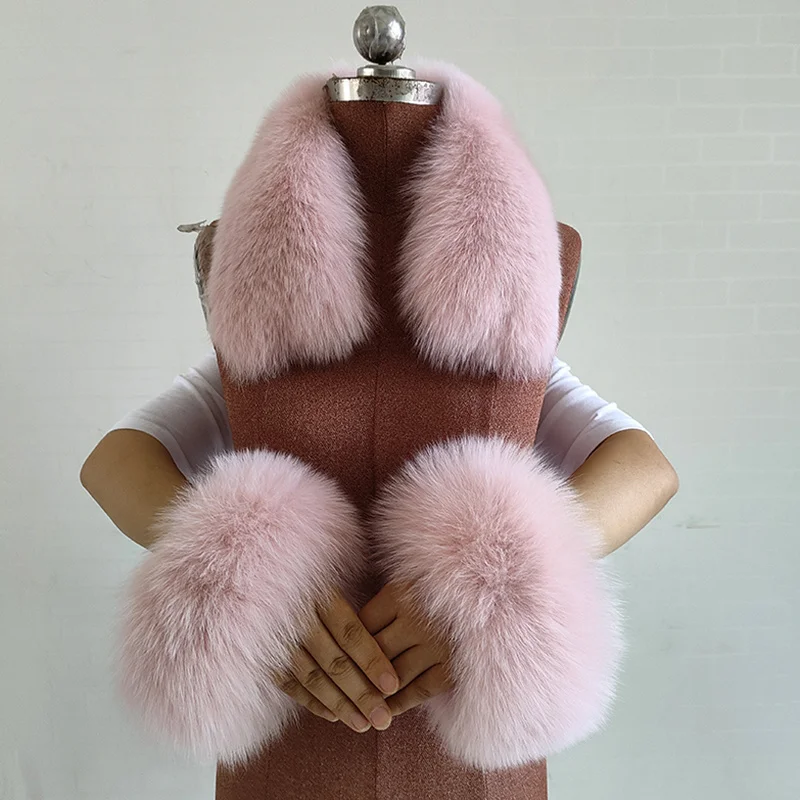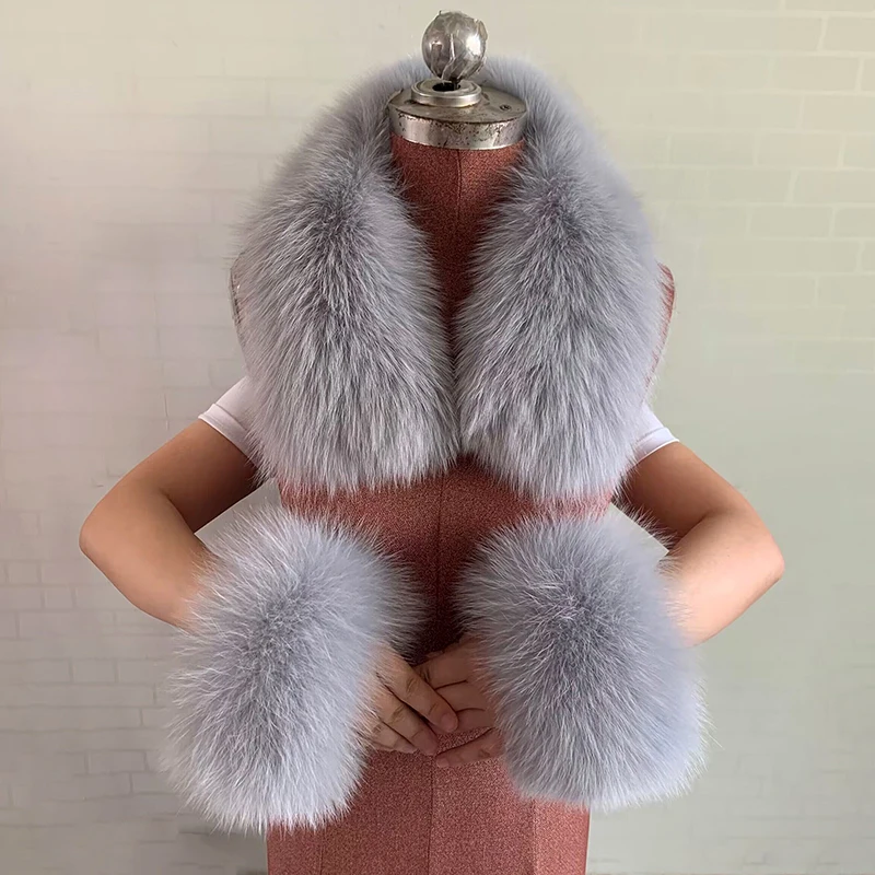 100% Real Fox Fur Collar Winter Coat Hood Fur Scarf Cuffs Set Jacket Match Overcoats Accessory Women Neck Warmer Scarves