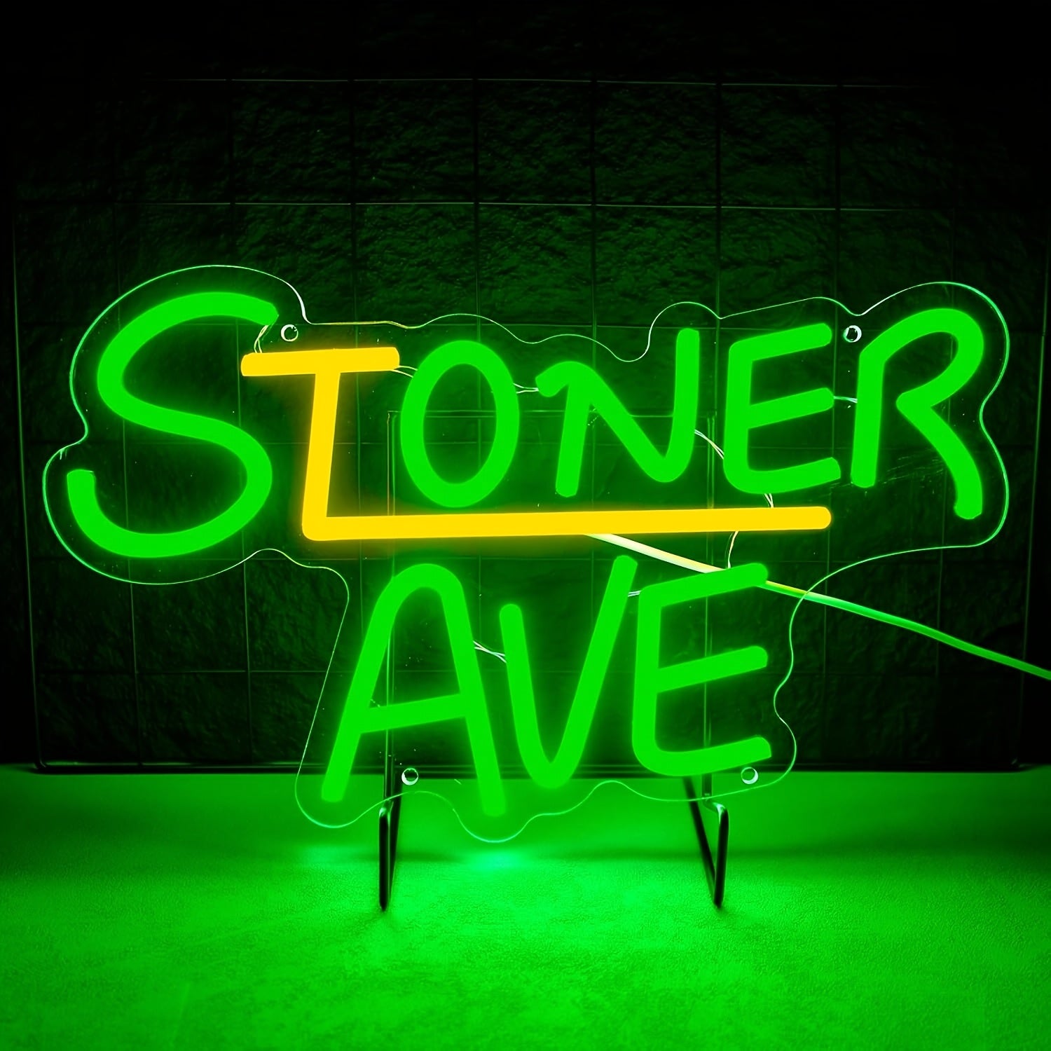 STONER AVE" Neon Sign - Green & Yellow LED Wall Art, USB Powered, No Battery Needed, Ideal for Man Cave, Garage, or Repair Shop Decor, Garage Wall Art | Retro Neon Style | Durable Plastic Sign, Neon Sign