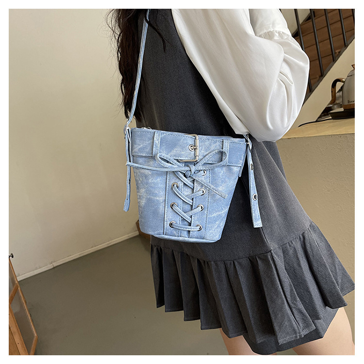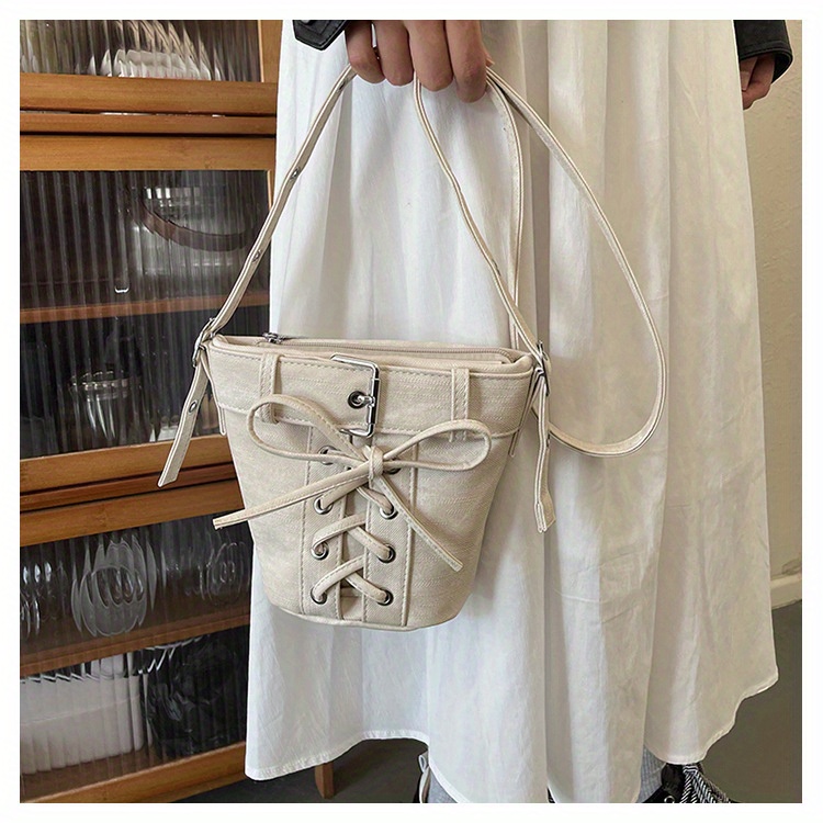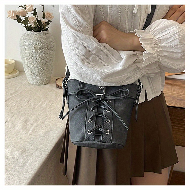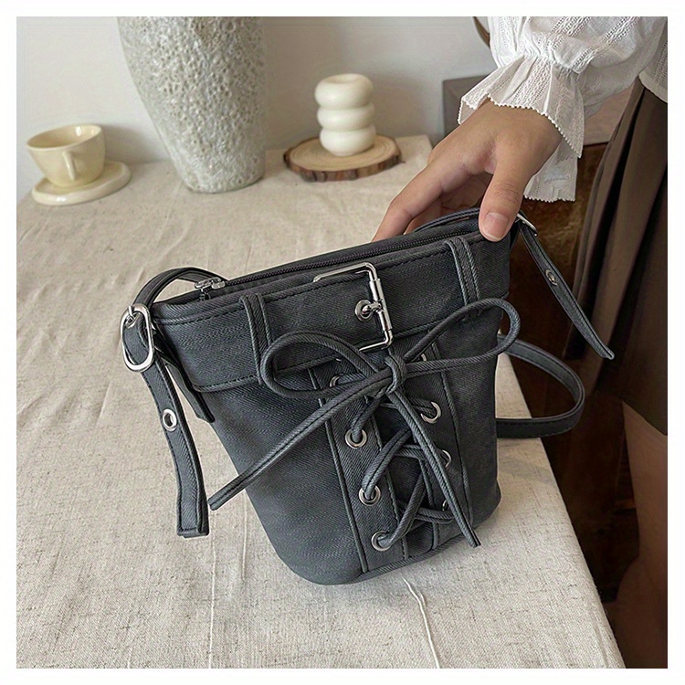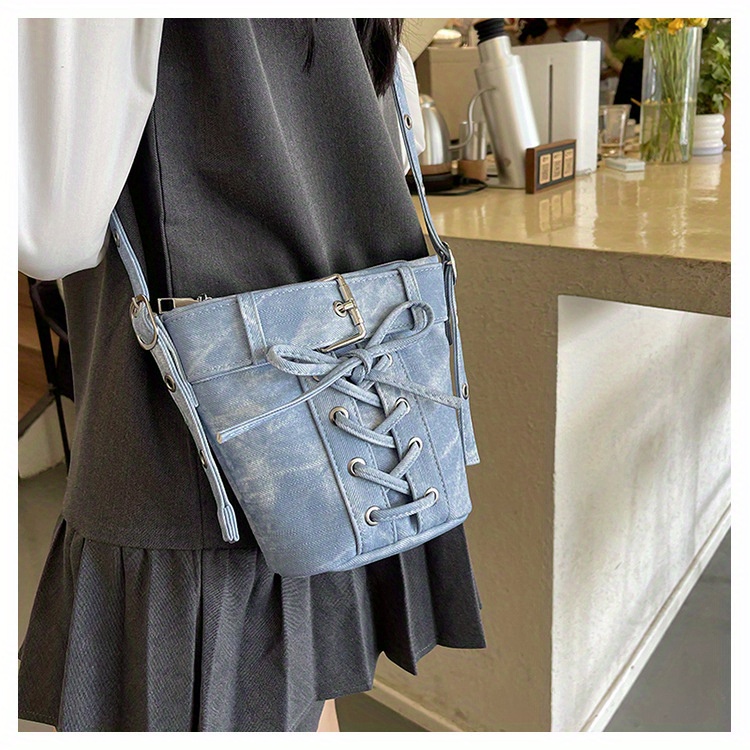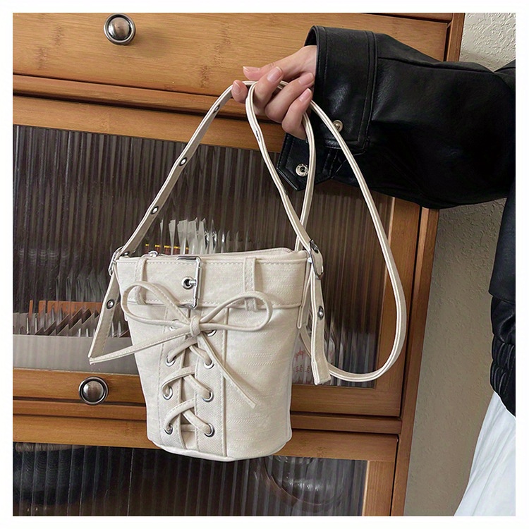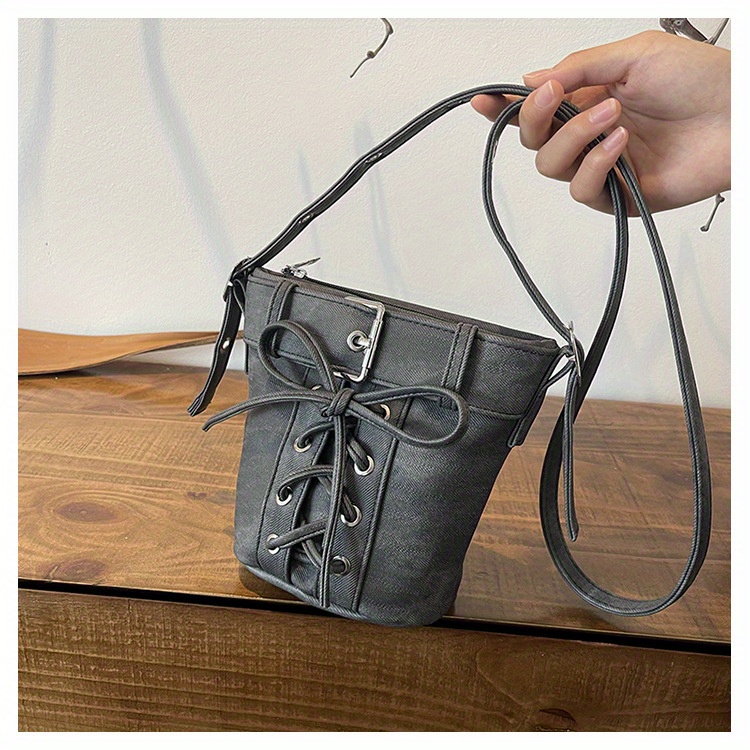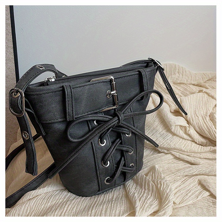 Women's Fashion Crossbody Bag, Vintage Simple Style, Bowknot Design, Denim Bucket Bag, Durable Travel Shoulder Bag Washable or Dry Clean, Oil-Edged, Polyester Lining, Zip Closure