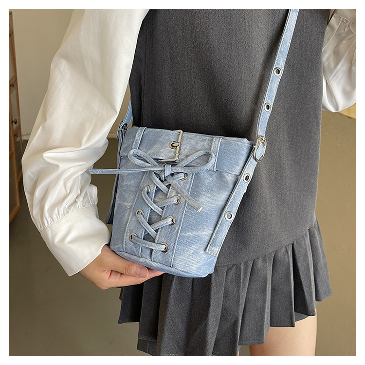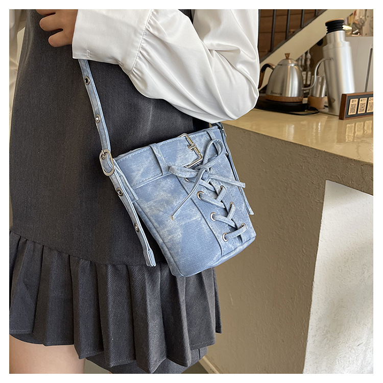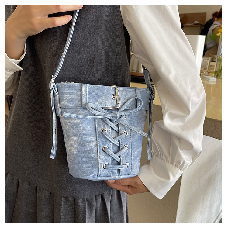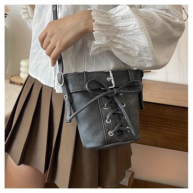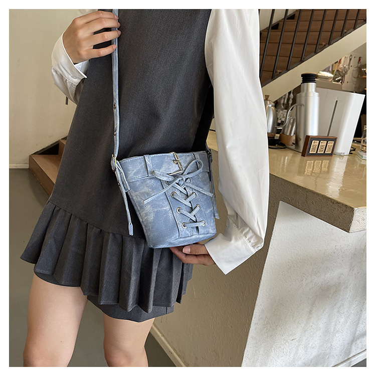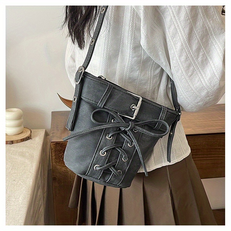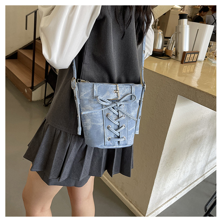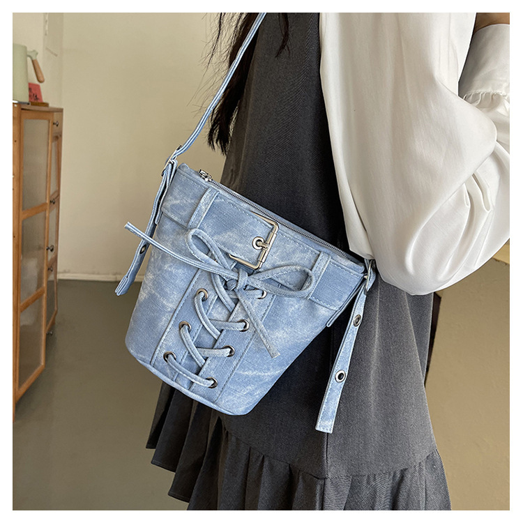 Women's Fashion Crossbody Bag, Vintage Simple Style, Bowknot Design, Denim Bucket Bag, Durable Travel Shoulder Bag Washable or Dry Clean, Oil-Edged, Polyester Lining, Zip Closure