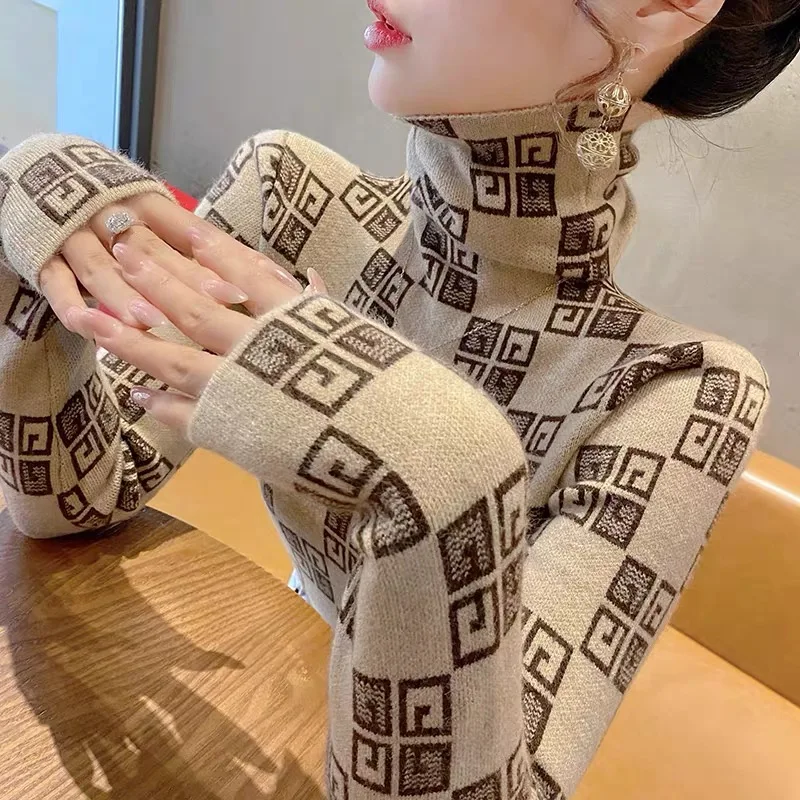Women's Turtleneck Vintage Jacquard Slim Sweaters Chic Casual Soft Knitted Pullovers